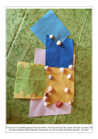 Franz hat ein Strandbild gebastelt unter dem Motto: "Ich freue mich auf den Strand, den Sand, das Meer und auf einen hoffentlich bald folgenden Ostseeurlaub, da will ich wieder Muscheln sammeln - mit Opa!